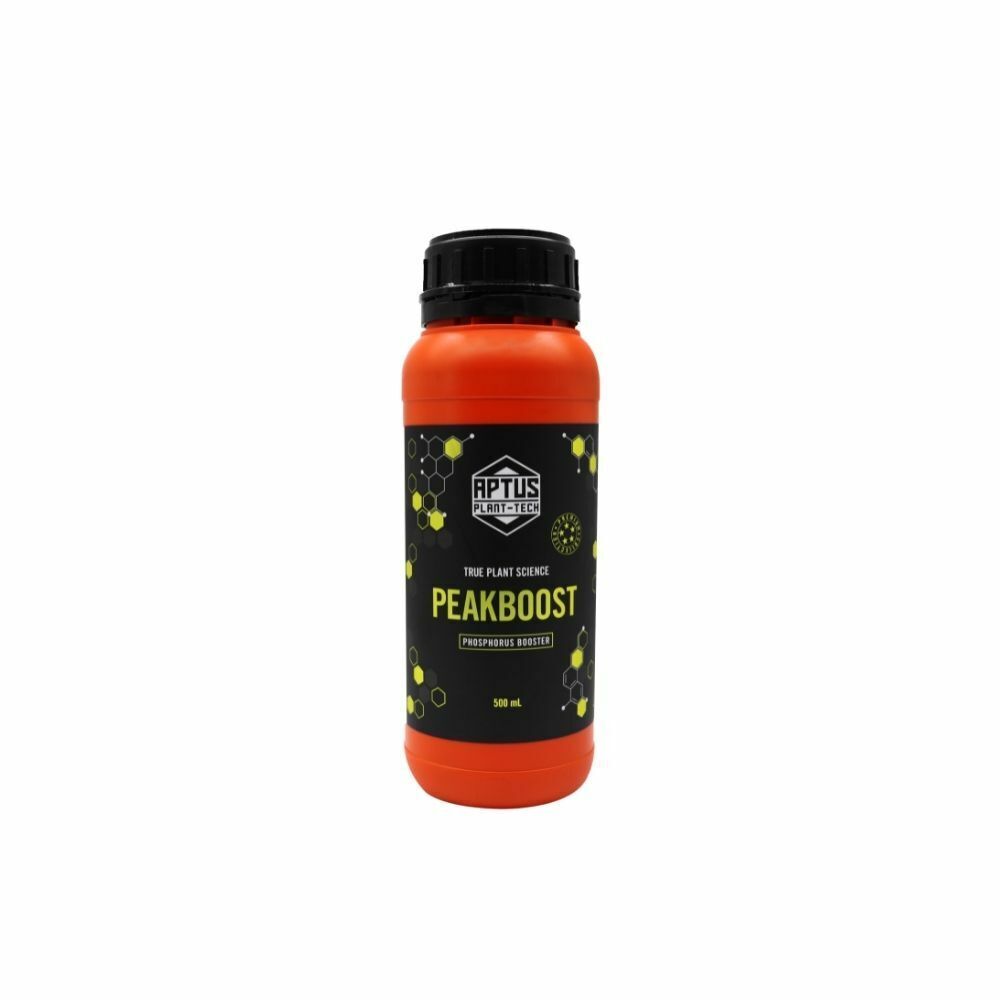 Aptus PeakBoost 500ml Peakboost along with its sibling product Finaleboost make up the Aptus flower development and bulking solution. Perhaps the most noticeable implementation of the Third Pillar of Aptus Philosophy: Mineral Antagonism. Peakboost moves the vast majority of phosphorous used during the bloom cycle solely into one product. With this formulation, Aptus has allowed for absolute control of heightened phosphorus application throughout the specific phases of a plant’s growth cycle. On top of allowing for specific phosphorous application in consideration of your plant genetics, stage in the growth cycle, or desired flower set behavior, the phosphorous in Aptus Peakboost is chelated into an organo-mineral product. With the addition of L-amino acids, the phosphorous has eye’s only for the plants’ roots and has a much smaller chance of being affected by outside factors. The specific application of chelated phosphorous allows for optimal health by removing the negative antagonistic effects of cheap bulk products containing high amounts of both phosphorous and potassium. With Aptus Peakboost, you will see the difference in your final harvest by having optimal chelated Phosphorous with the elements usually antagonised away including: zinc, iron and copper.