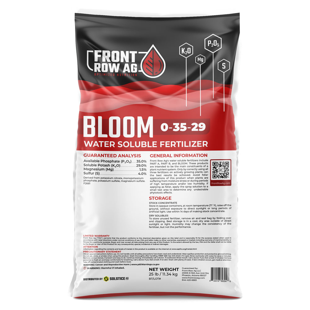 Bloom provides a unique formulation designed to complement Part A and B by delivering the elements flowers need for explosive growth, density, and ideal internodal spacing. Bloom maximizes flowering by providing critical concentrations of magnesium, sulfur, phosphorus, and potassium.