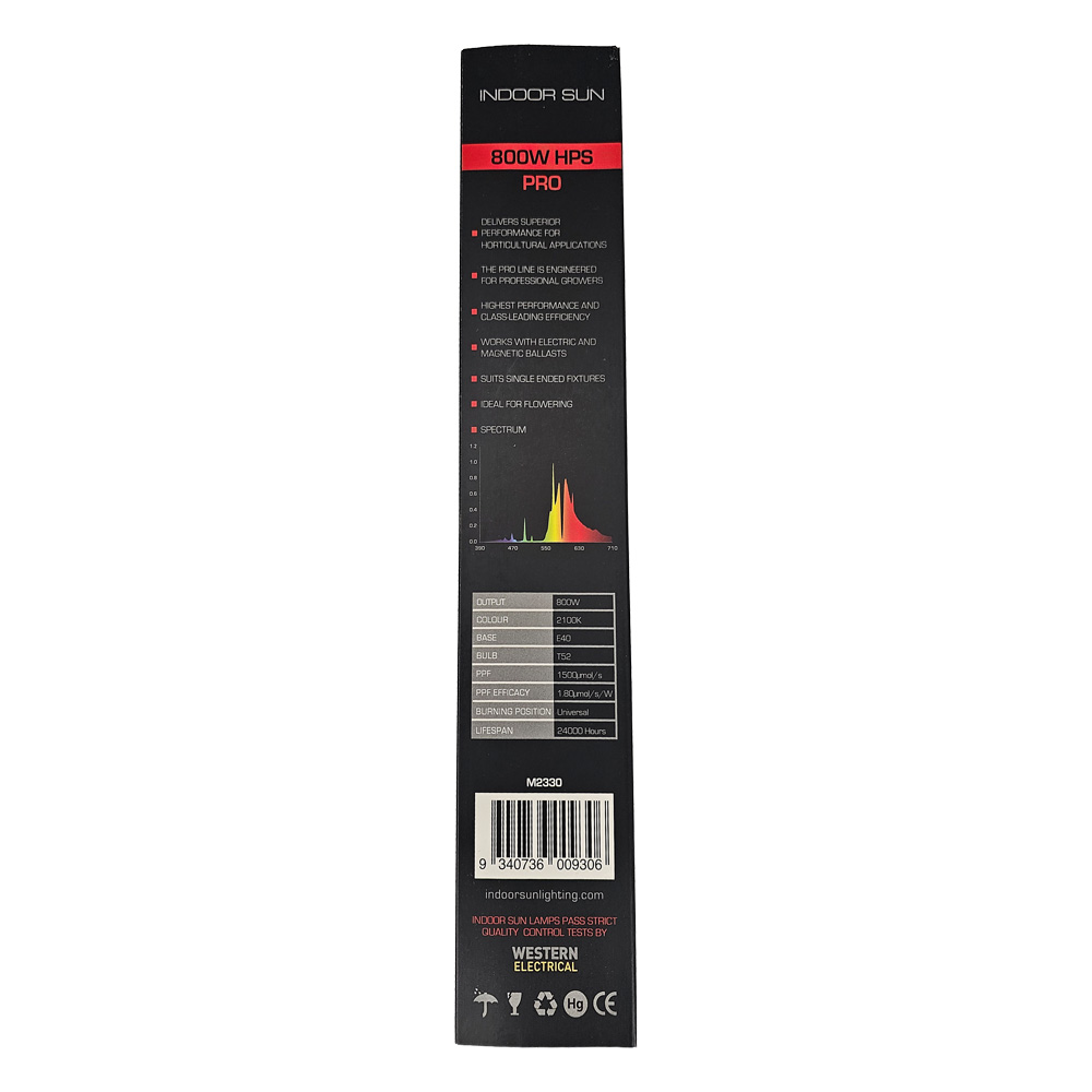 QUALITY INDOOR SUN 800 watt PRO HPS lamp HPS High 1.80 PPF efficiency output combined with an extended life OF 24000 HOURS for use with 800 watt HPS lighting systems.