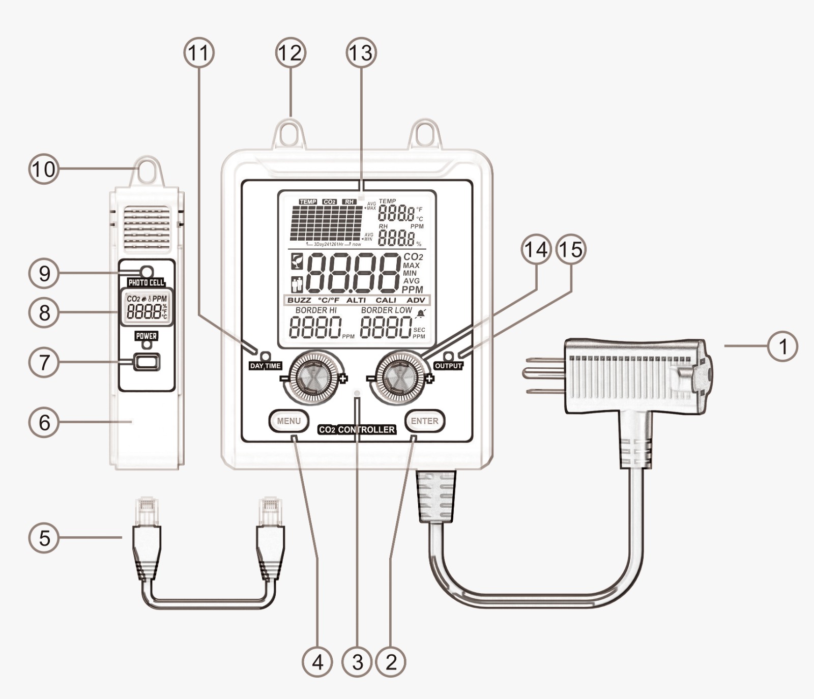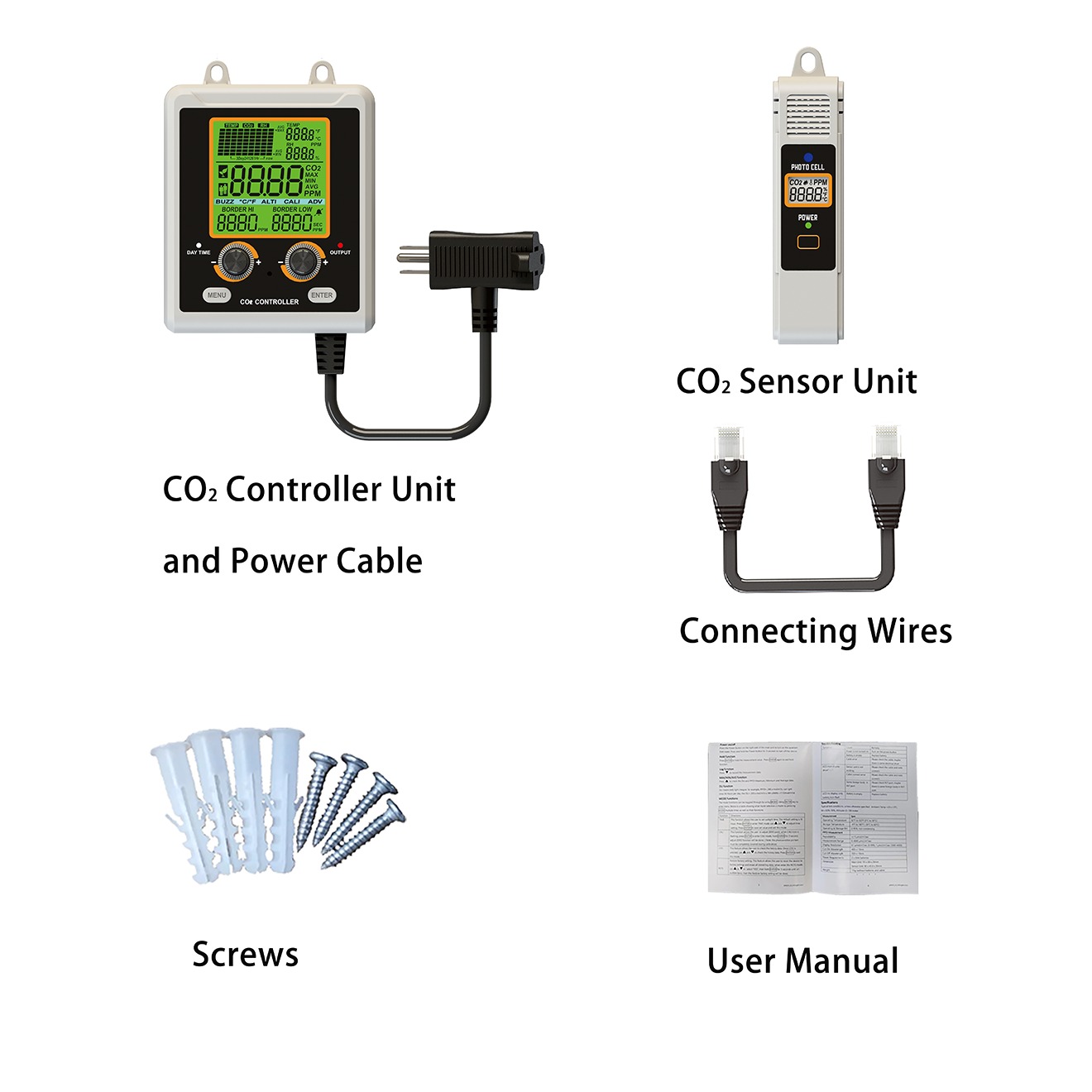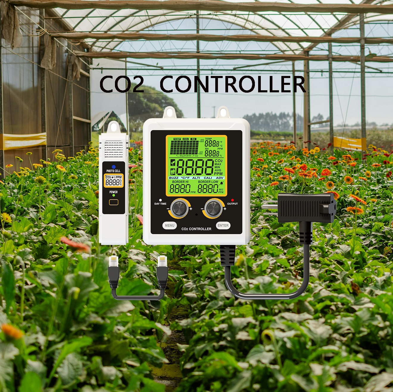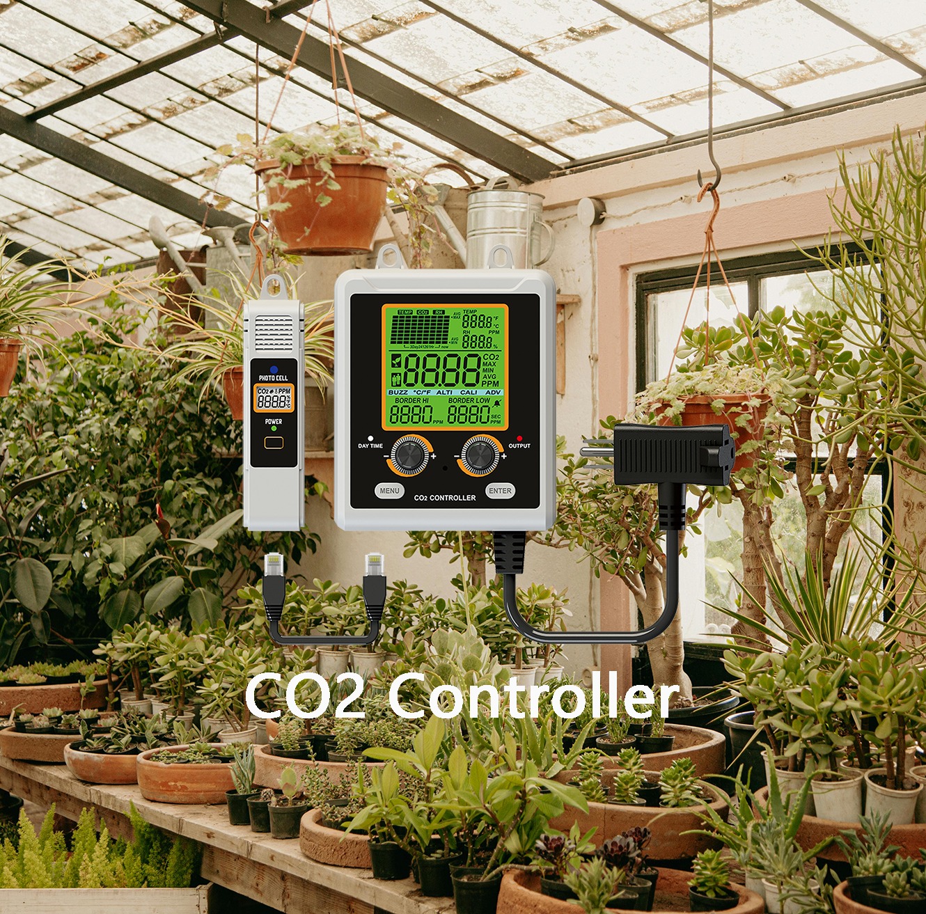 A built-in Day/Night sensor detects light levels to regulate CO₂ supply only when needed, ensuring efficient use and optimal plant performance. Dual LCD screens clearly display CO₂, temperature, and humidity readings, while an intuitive rotary knob makes it easy to set target levels.